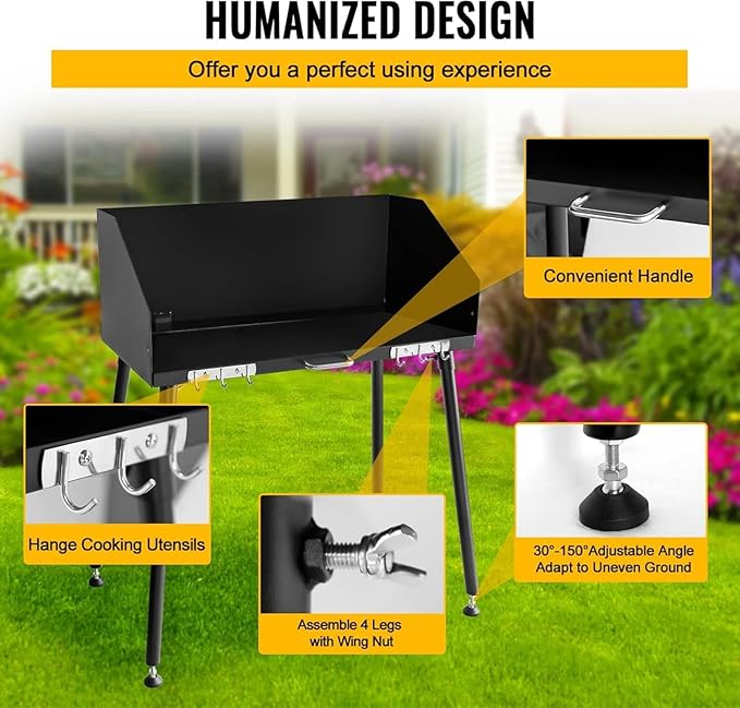 - Humanized Design—The size of our camp cooking table: 38'' L x 16'' W. The 1.2 mm thickness tabletop makes it load 132 lbs / 60 kg max capacity; the three-sided windscreen can ensure the stability of your cooking fire; it has a foldable and detachable design, so you can transport and store it effortlessly; the hooks are well-designed for hanging spoons, brushes, and other cooking utensils; the handle brings you an easy operation; Adjustable 0.8 inch height and 30-150 degree Angle adjustable feet