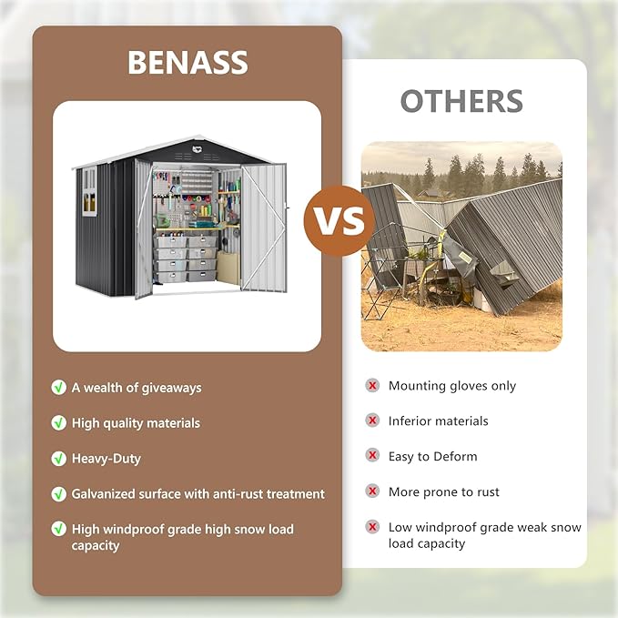 - 【Easy Assembly & Customer Support】:The tool shed includes clearly labeled components, detailed assembly instructions, and protective gloves to ensure an efficient setup. Assembly by 2-4 adults is recommended. For any questions or assistance during assembly or usage, please reach out directly to our friendly customer support team.