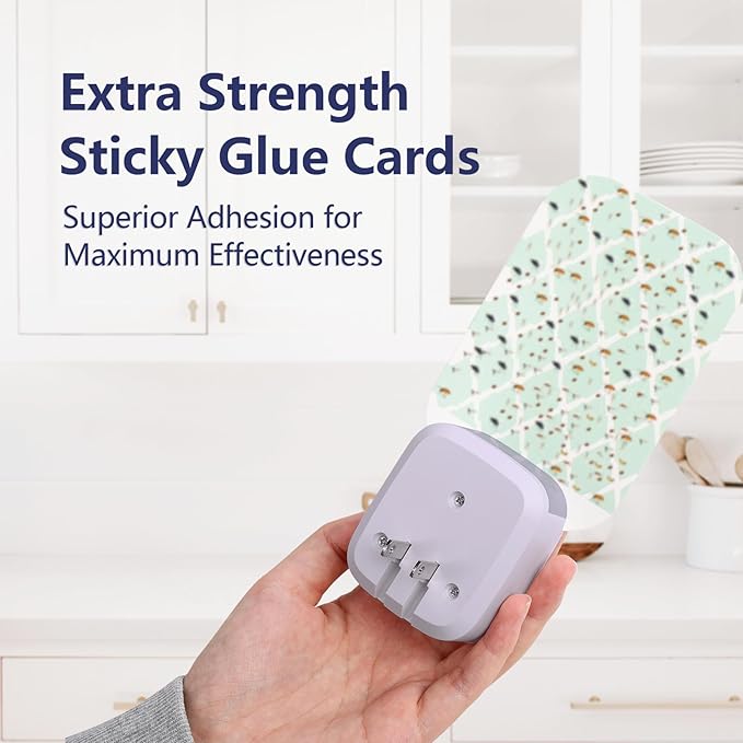 - Compact and Stylish Design: Sleek, space-saving device with strong glue cards to trap insects discreetly