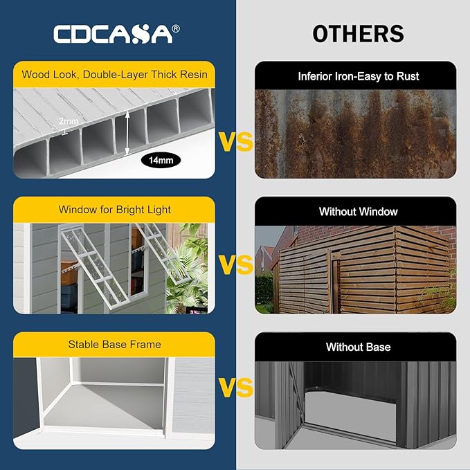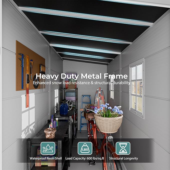 - 【Premium and Durable Material】The 14mm tough double-wall resin construction, 0.6 mm galvanized steel frame and impact-resistant floor are designed for long-term durability. The double-wall panels are waterproof and moisture-proof, allowing worry-free use in all weather conditions. It is weather-resistant, waterproof, and UV-resistant-no peeling, rotting, or rusting. The screws are embedded to ensure aesthetics and safety