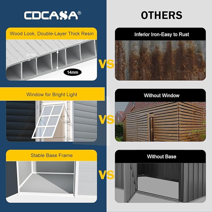 - 【Premium and Durable Material】The 14mm tough double-wall resin construction, 0.6 mm galvanized steel frame and impact-resistant floor are designed for long-term durability. The double-wall panels are waterproof and moisture-proof, allowing worry-free use in all weather conditions. It is weather-resistant, waterproof, and UV-resistant-no peeling, rotting, or rusting. The screws are embedded to ensure aesthetics and safety