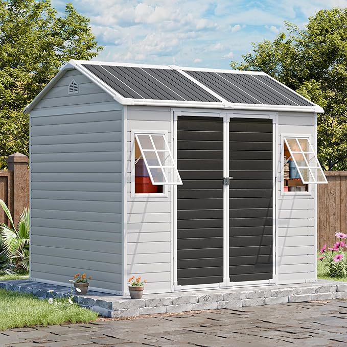 CDCASA 8x6 FT Resin Storage Sheds with Floor, Waterproof Large Outdoor Sheds and Adjustable Openable Windows,Outside Plastic Tool Shed for Backyard Garden Patio Lawn