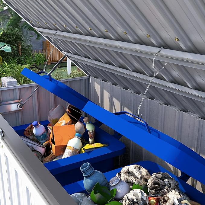 - Portability and Security: When used as an outdoor trash can storage, the design includes independent, upward-opening lid hooks that attach directly to the garbage can lid. A hydraulic mechanism ensures smooth opening and closing. Lockable double doors extend to 47 inches, allowing for the storage of longer items like bicycles and enhancing security, making it a versatile solution for both bike storage and outdoor storage.