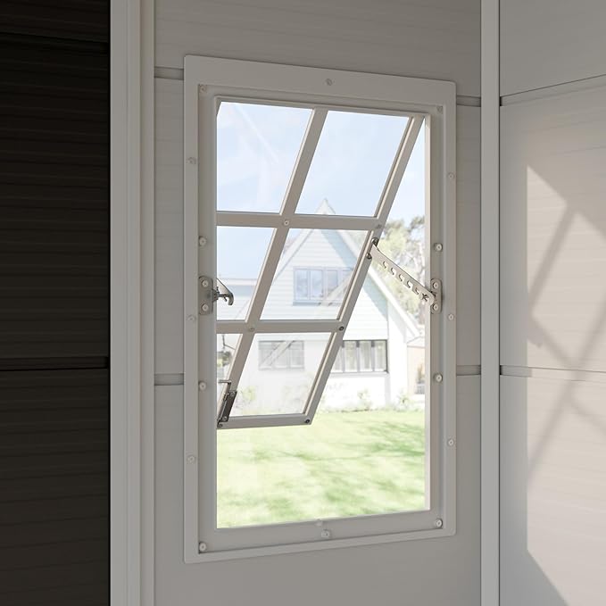 - 2 Adjustable Windows: Outdoor shed featuring adjustable windows, you can control the opening angle to let in light and airflow. Even on rainy days, the interior stays dry and well-ventilated.