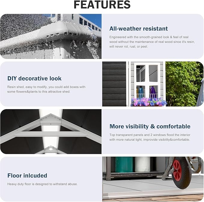 - Durable Resin Storage Shed:Made with thickened, high-quality resin and featuring integrated wood grain patterns, it offers enhanced durability while maintaining an attractive appearance.This material easily adapts to any outdoor climatic conditions.